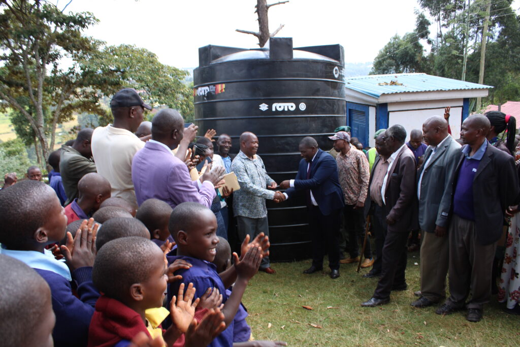 Hon Anthony area MCA Gesuu ward issuing 10,000 litre water tank to Riasibo primary school.